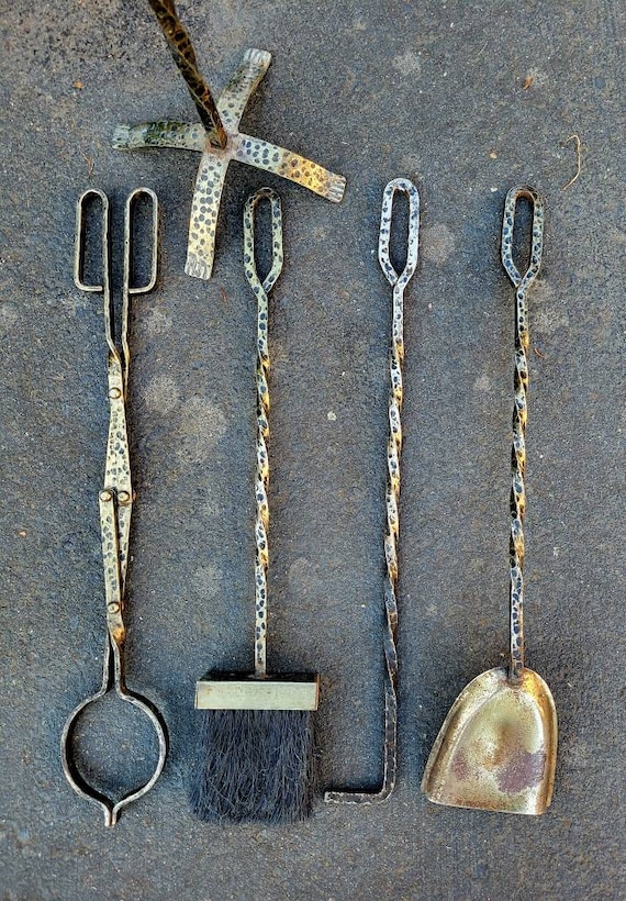 Brutalist Brass Finish Hammered Fireplace Tools Stand Etsy Uk